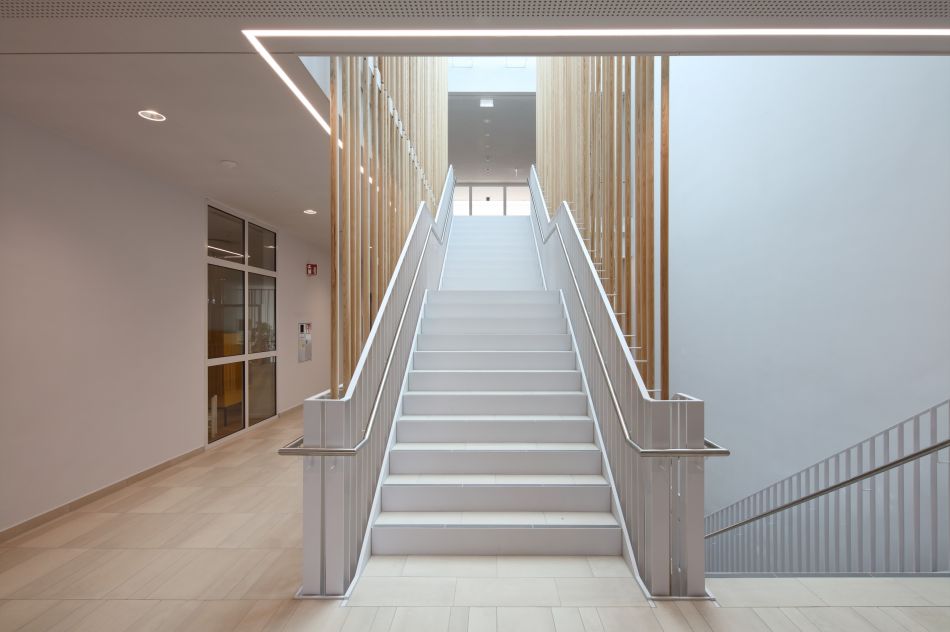 die großzügige Treppe des Mittelbaus begleitet uns zu den Empfängen der Ambulanzen im ersten Obergeschoss.