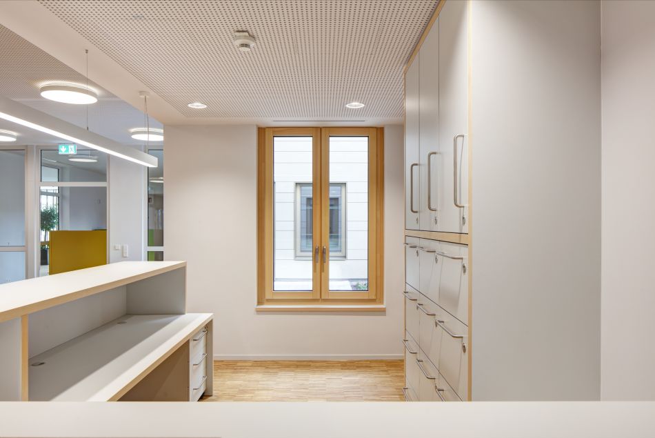 Glasfelder neben Türen zu Räumen der Gemeinschaft ermöglichen vorab einen Blick hinein oder umgekehrt.