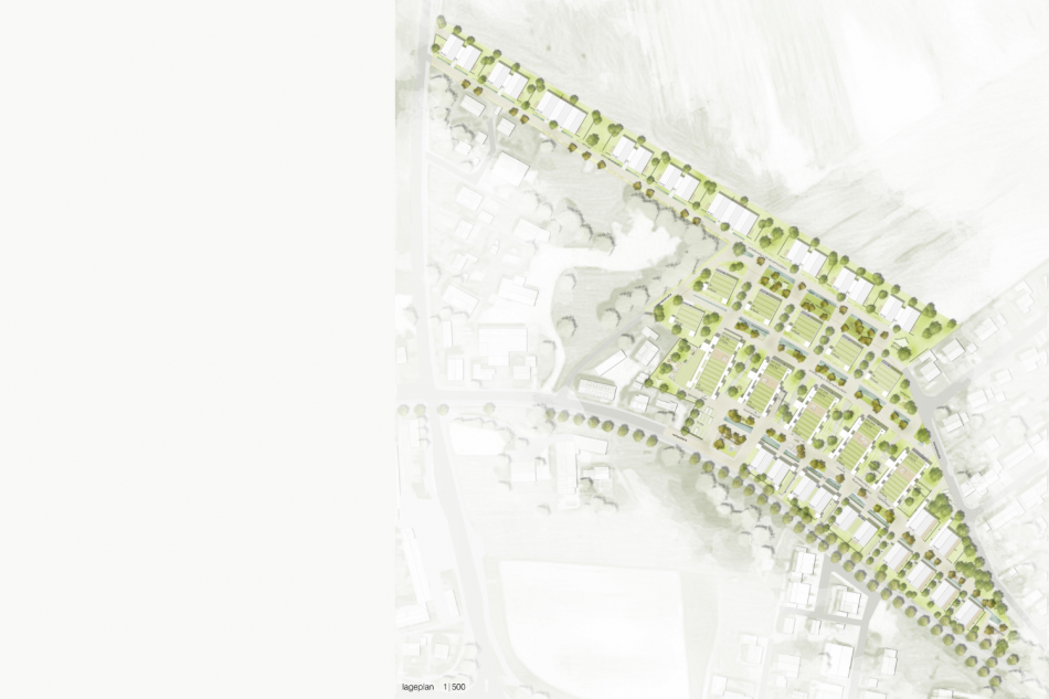 I der vielfältig gegliederte neue Stadtteil / Teilort muss Verdichtung einerseits und versöhnliche Anbindung an die gewachsenen – eher gestreuten Stadtrand-Bebauungen andererseits leisten