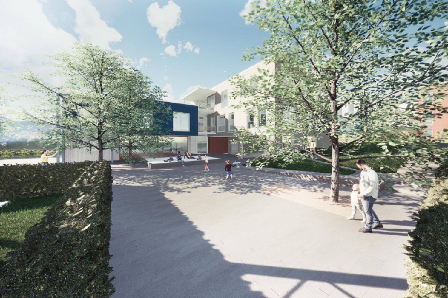 + wir schlagen einen bisher einzigen wohnungs-nahen und auch für die nachbarschaft offenen aufenthaltsbereich für kinder und erwachsene unter freiem himmel und in den unteren ebenen der häuser 4 und 5 an