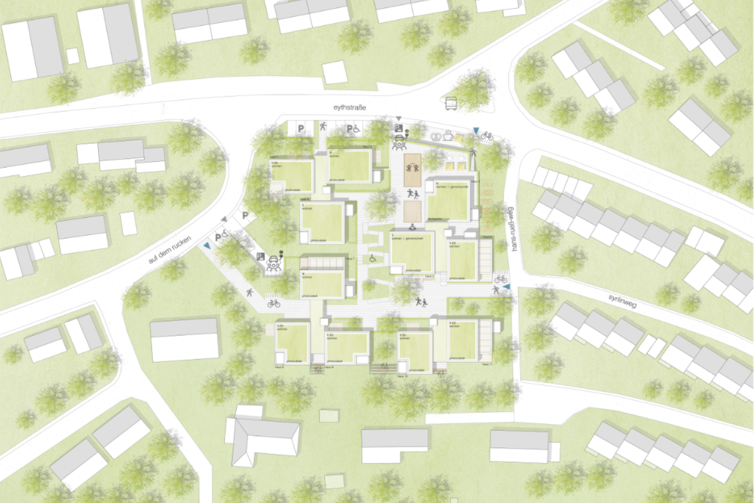 eingebettet in eine umgebende bebauungs-struktur aus einzel- und reihenhäusern kann unser vorschlag als ein identitäts-stiftendes ensemble wahrgenommen werden, dass einerseits als etwas besonderes in der umgebenden wohnlandschaft gesehen werden kann, aber dennoch auf durchlässigkeit und auf neugierde am neuen setzt, um im stadtquartier bei allen angenommen zu sein, die seit generationen auf dem rucken ihre heimat erleben: