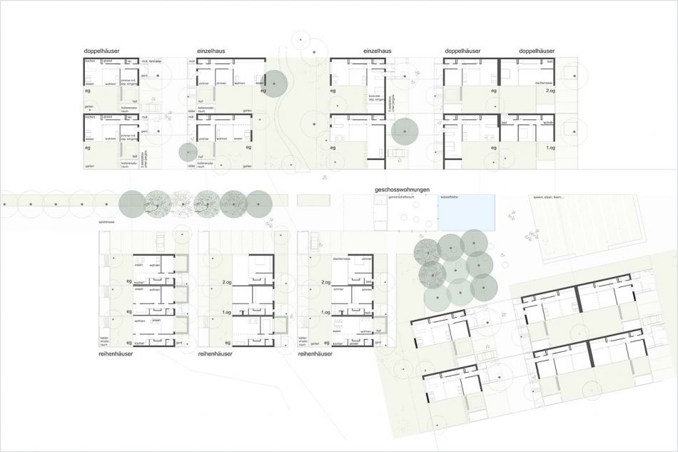 Der Entwurf bietet eine Mischung von Wohnsituationen: zusätzlich zu den dominierenden Einzel- und Doppelhäusern ist ein Bereich mit Reihenhäusern und einige wenige Geschosswohnungen am zentralen Anger vorgesehen.
